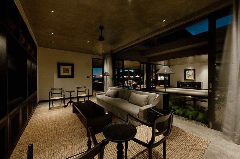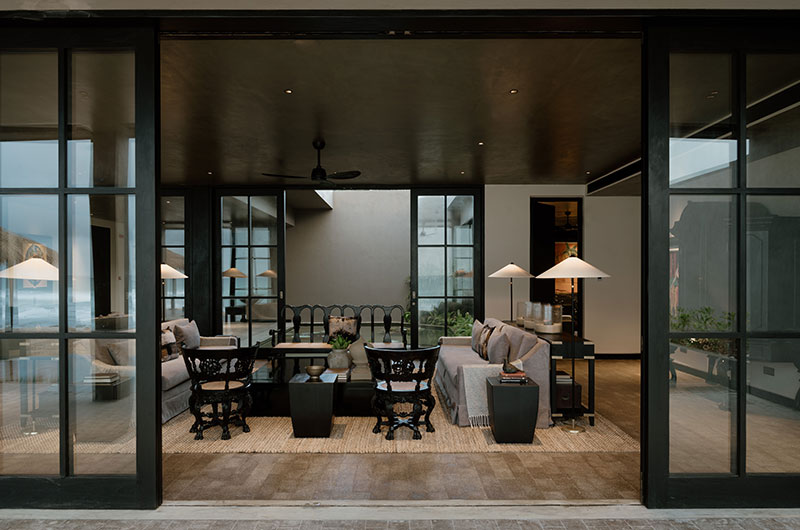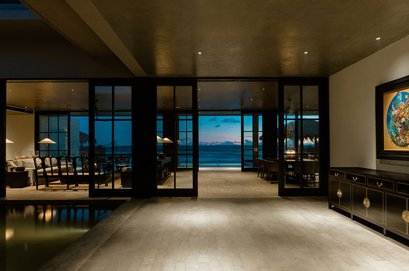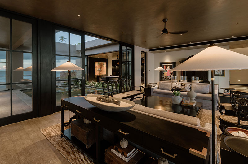 The living room is a relaxed space that invites everyone in to sit, chat, and enjoy themselves. The room features plush grey sofas and plantation chairs with some real vintage charm, with full wall windows framing beautiful views of the beach.