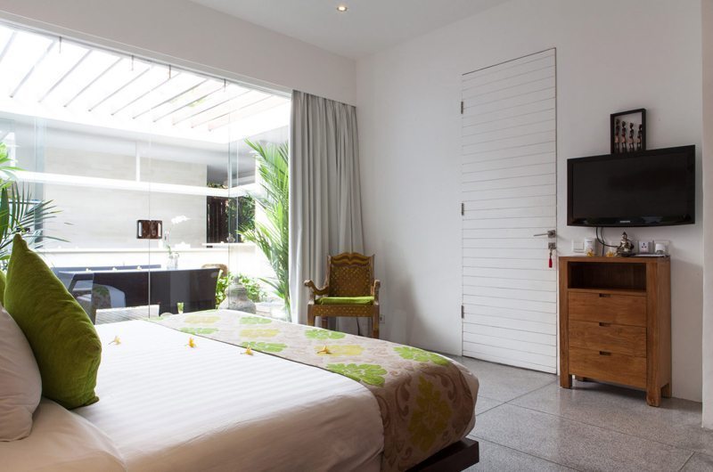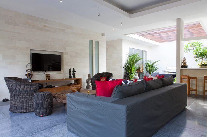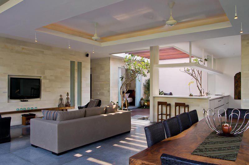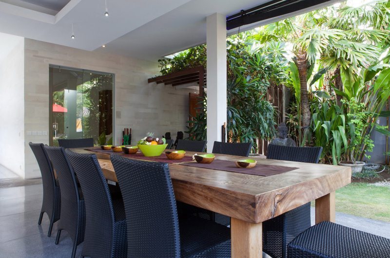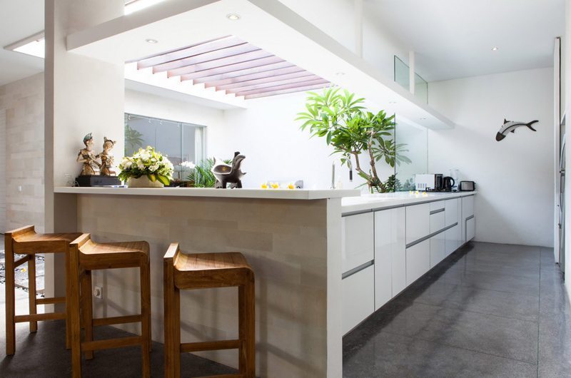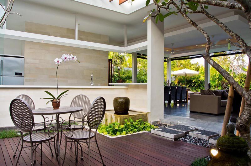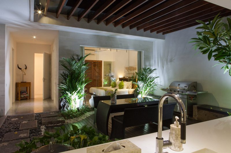 The dining table which seats up to 10 guests is a great spot to socialise over meals. The striking centre piece of Villa Bersantai is its ultra-modern kitchen – an amateur cook’s dream come true! The kitchen features everything you could possibly need to whip up a storm. A built-in BBQ surrounded by frangipani trees is positioned in the inner courtyard that has a glass-top roof.