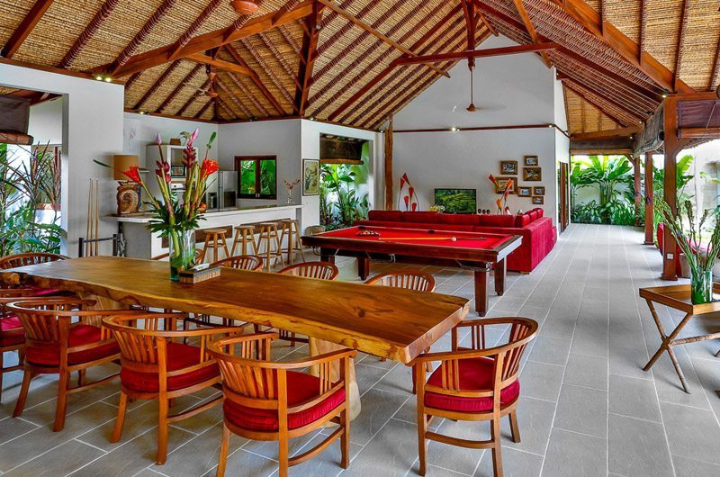 The open-plan living and dining area on the ground floor is expansively huge forming the perfect venue for special celebrations with friends and family. The living area directly faces the swimming pool and lush tropical gardens and you can spend your evenings simply admiring the beauty outside. The living area has a scarlet L-shaped sofa positioned around a flat screen TV and entertainment system. Behind this is a billiard table where you can challenge your friends to a game of pool.