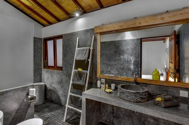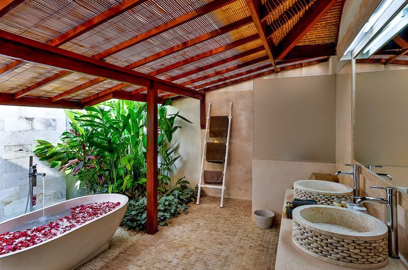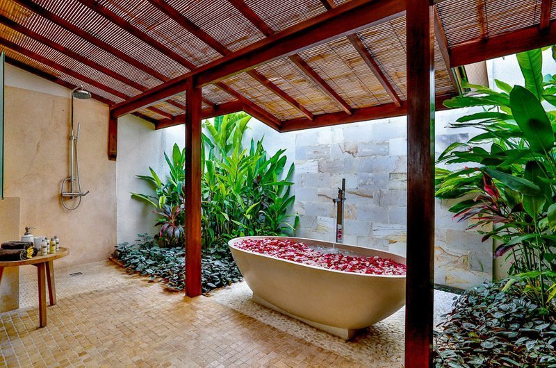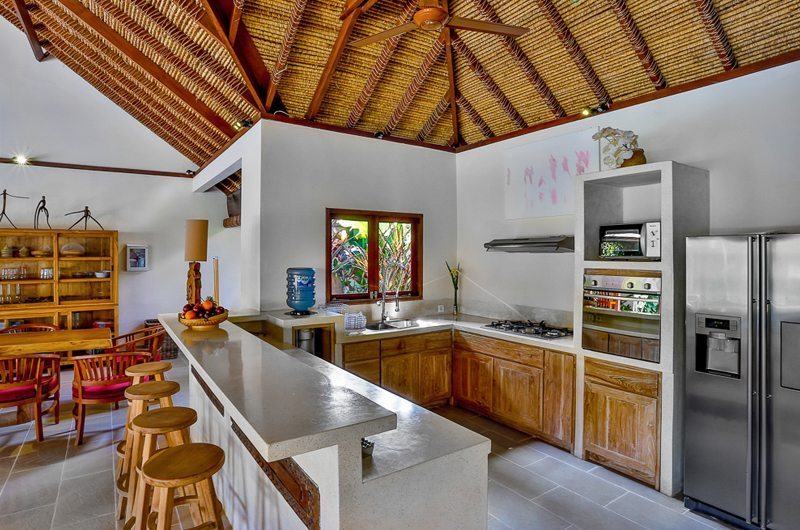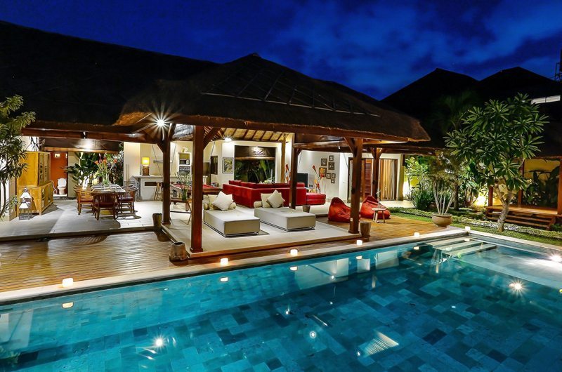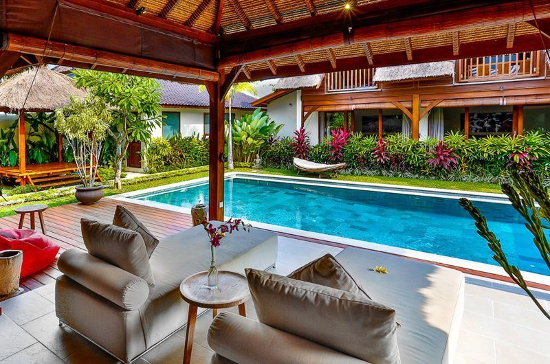 The villa’s spectacular outdoor features will leave you enchanted, making it difficult to leave this tranquil sanctuary. A magnificent swimming pool forms the centrepiece of Villa Bibi with tropical plants and blooming flowers around the deck. The lighting effect created by the pool after dusk makes it an ideal spot for a romantic dinner or a BBQ meal. At one end of the pool is an oversized pool bale where you can curl up with your favourite book, enjoy a pampering massage or sip tropical cocktails on a hot sunny day. The pool deck has plenty of sun loungers and leaf-shaped day beds to soak up the warmth of the sun. The living room has an extended covered area with two couches for you to relax under the shade and feel the cool breeze soothing your senses.