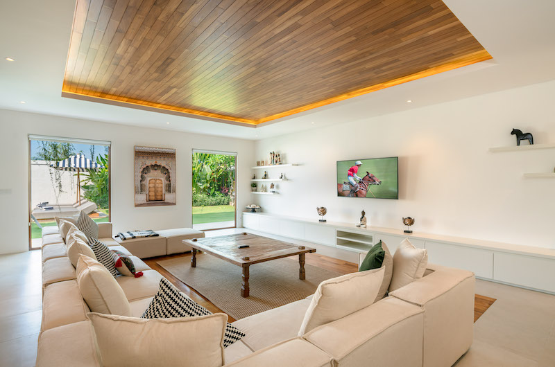 The living room is a light and airy space surrounded by white walls and glass doors which slide open to the pool and garden. There’s plenty of space for the whole group to gather round in with three light sofas arranged around a wooden coffee table. You can leave the doors open to enjoy a tropical breeze or close them when you wish to indulge in air-conditioned comfort. The villa has two TV rooms – one on the ground floor next to the living areas and one upstairs, conveniently located right next to the kids’ bunk room. As an added perk, this room also comes with Nintendo Switch!