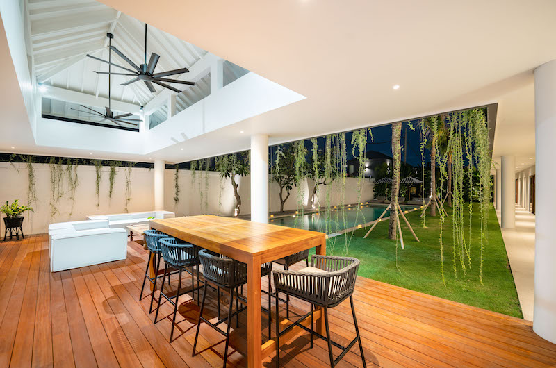 The villa’s dining area is built into the living room, allowing guests to dine in air-conditioned comfort. The wooden dining table is surrounded by wooden benches and wicker chairs, with a fully-equipped kitchen tucked to the back of the room.