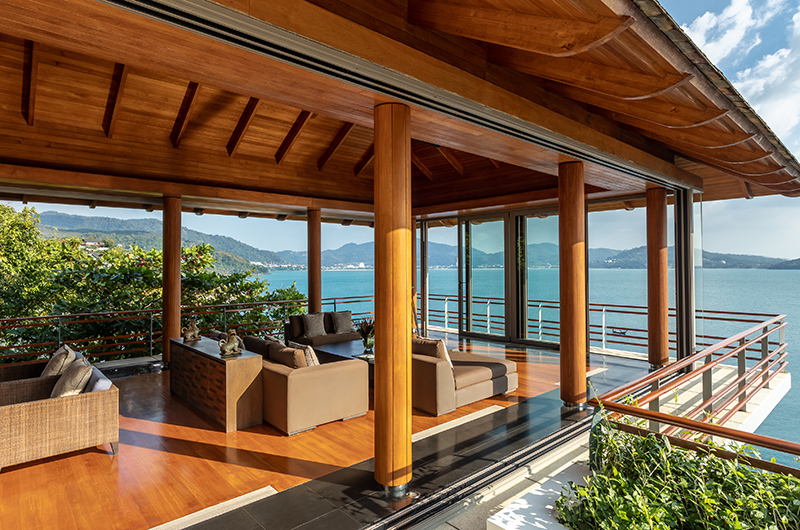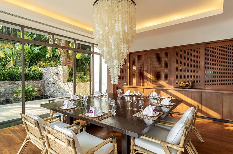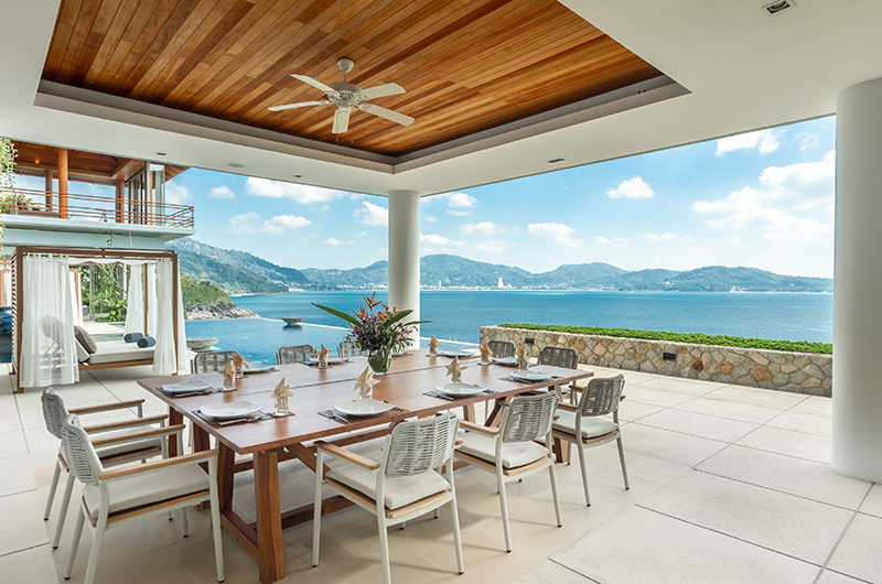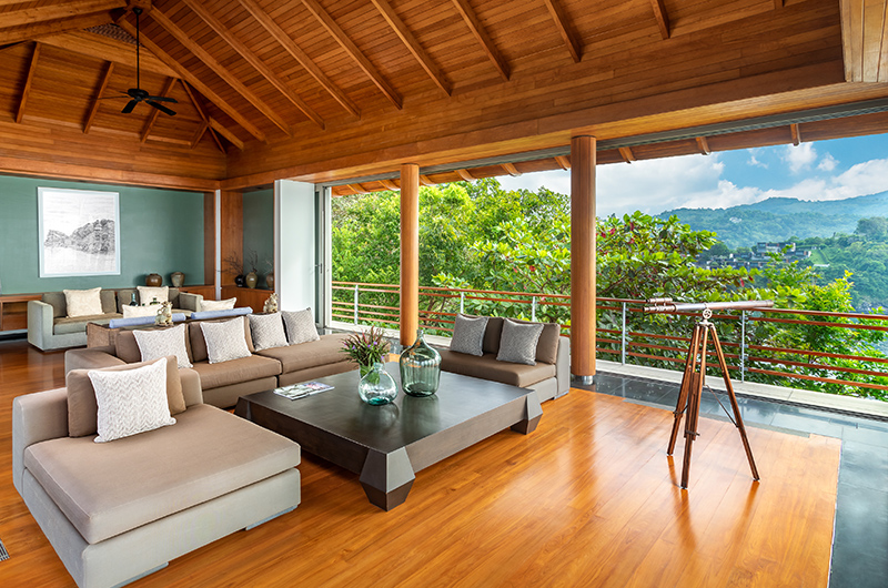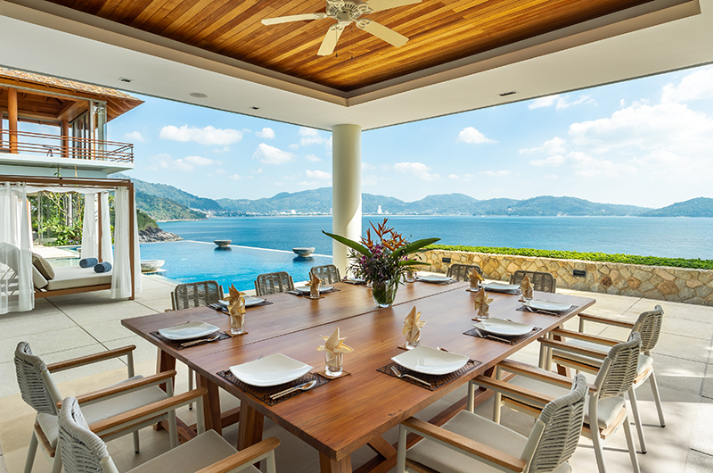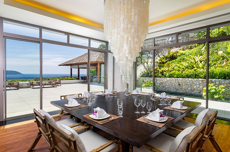 Like all rooms in the villa, the living room is housed in a stunning glass pavilion with views sweeping over the Andaman Sea and over to Patong Beach. The room even has long view binoculars available to help you really drink in the views! You can leave the glass doors open to relish a fresh tropical breeze or close them to relax with the AC on. Plush sofas provide enough space for 14 guests while a top of the line sound system ensures that the soundtrack is always on point.