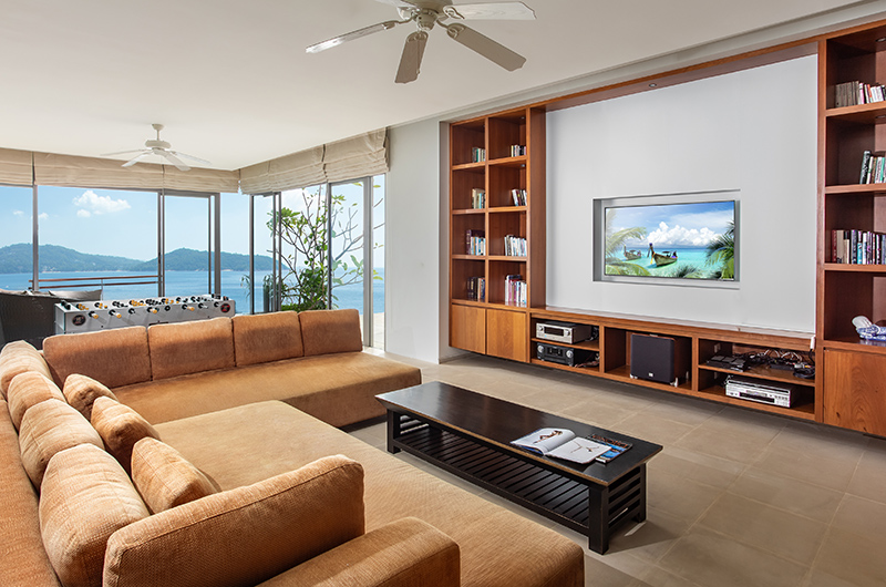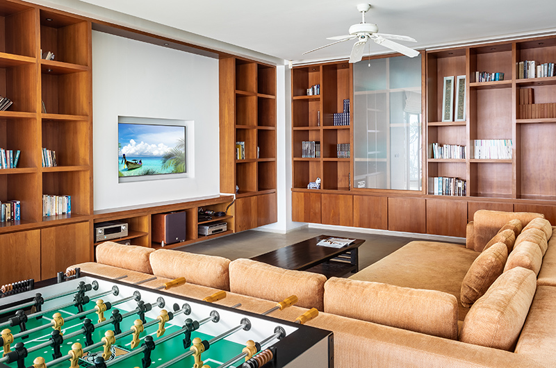 The scenic media room is poised for fun and games. Surrounded by the villa’s signature sea views, this spacious room is fitted with a large flatscreen TV and JBL sound system and features a lavishly large sofa to relax on. There is also a foosball table to keep everyone entertained as the night wears on.