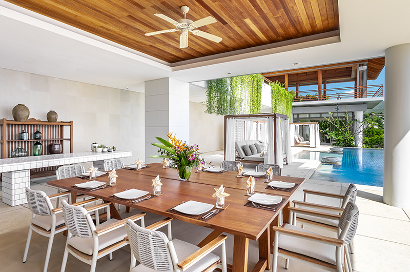 The formal dining room is a grand space surrounded by full wall windows and dominated by a gorgeous shell chandelier. The square dining table is crafted from dark timber and can seat up to 12 guests on wicker dining chairs. This air-conditioned room is also fitted with a JBL sound system. The villa’s fully equipped kitchen is located right behind this elegant room. What’s more, there are two alfresco dining pavilions for guests to choose from, each of them offering sublime views of the ocean and the ultimate setting for enjoying relaxed barbecues and lavish feasts alike.