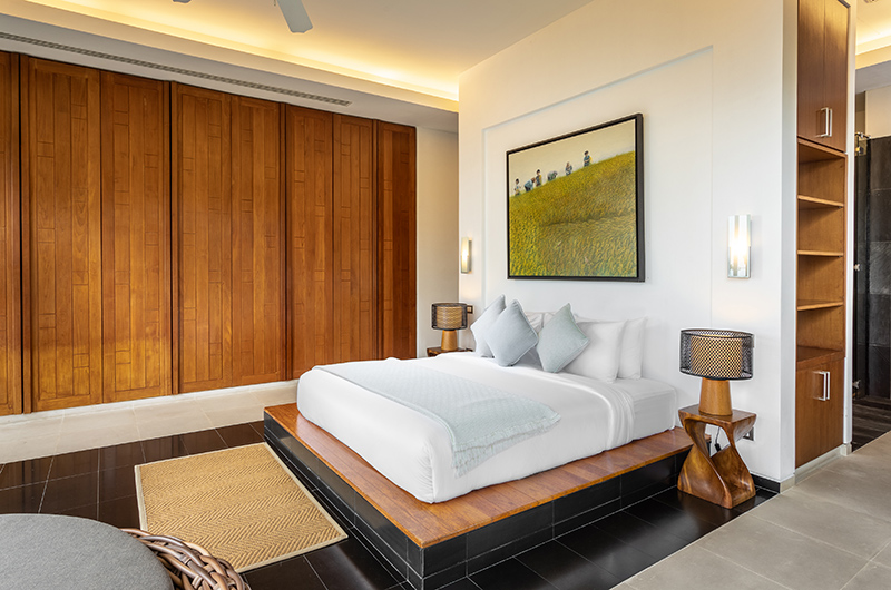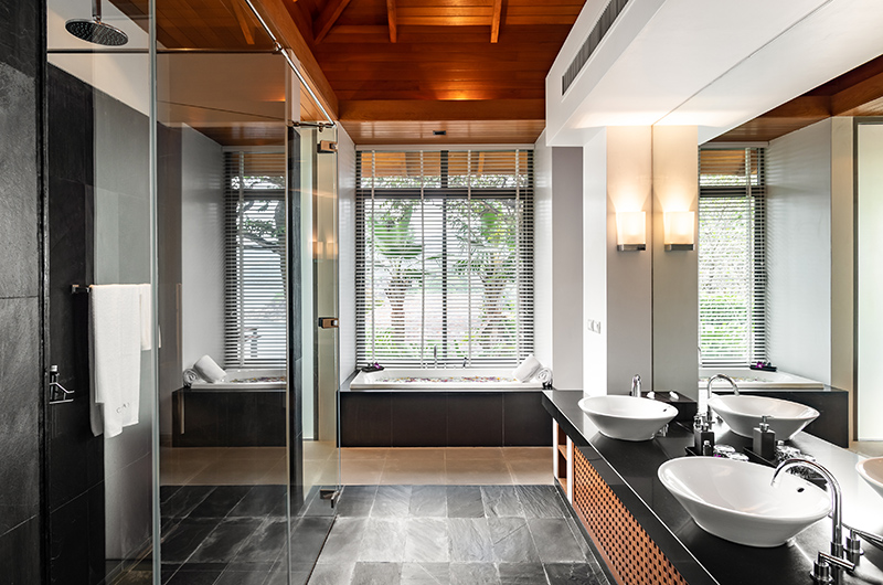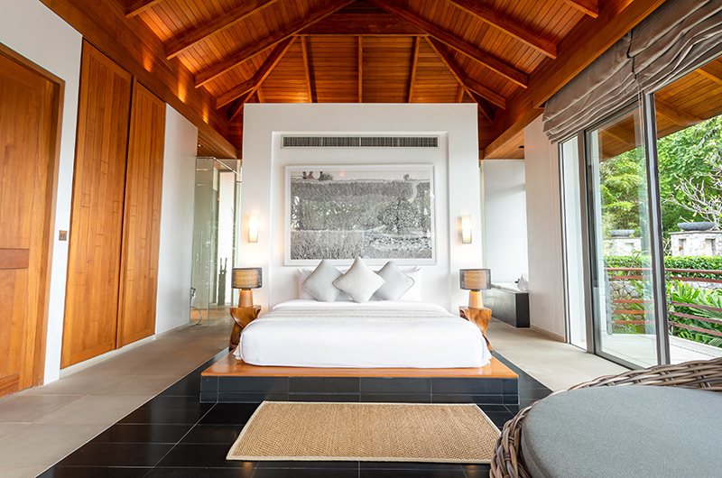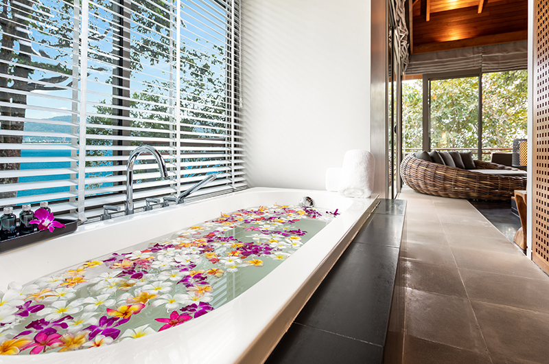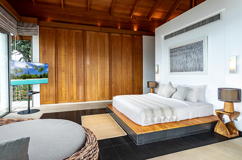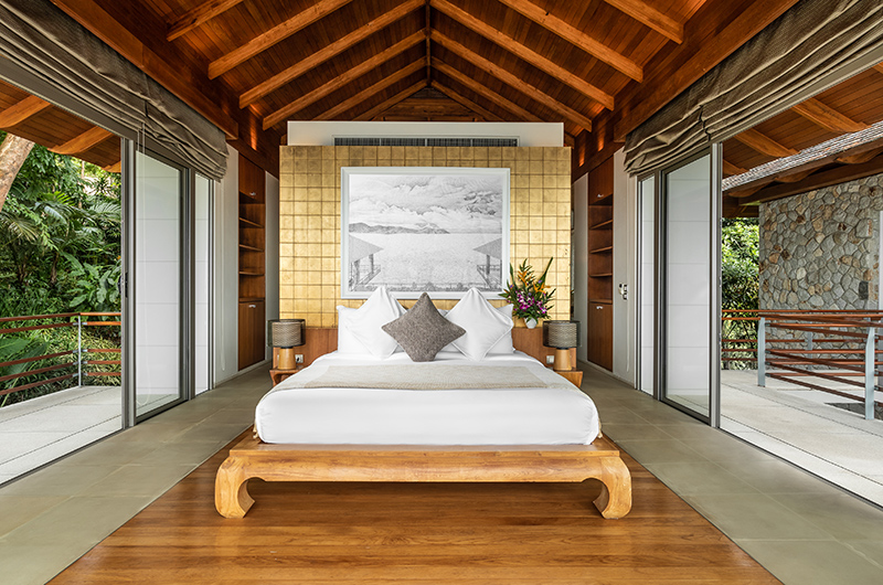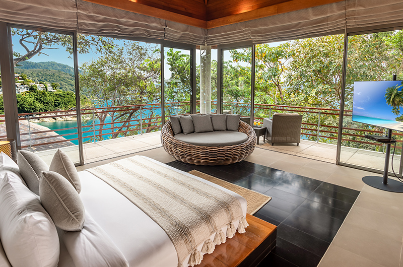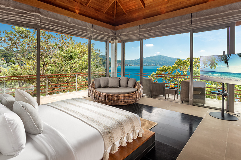 The first bedroom sits on the fourth floor of this five-storey villa. The room is surrounded by full wall glass on three sides with a plush king-sized bed facing picture perfect panoramas of the Andaman Sea. You can get even closer to those views by stepping out to the wraparound balcony. The bedroom also has a flatscreen TV to keep you entertained and a mini fridge for snacks and beverages. The ensuite bathroom is endlessly glamorous and features an oversized circular bathtub, rain shower, dual vanities and a toilet.