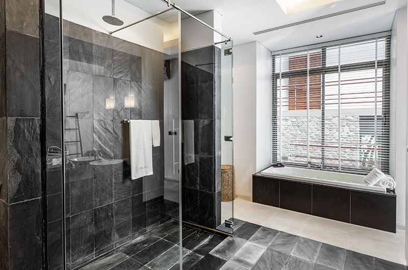 The third bedroom is one of two bedrooms located on the villa’s top floor. This bedroom also occupies a scenic glass pavilion with doors opening to a private ocean view balcony. The bedroom itself features a king-sized bed, TV and a large circular chair. The streamlined bathroom is fitted with a bathtub, walk in shower, double vanities and a toilet.
