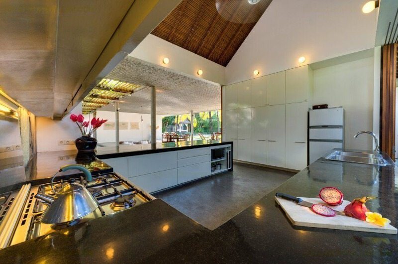 Also located in the open-sided living pavilion, Villa Cocogroove’s round dining table is followed by a fully-fitted open-plan kitchen.