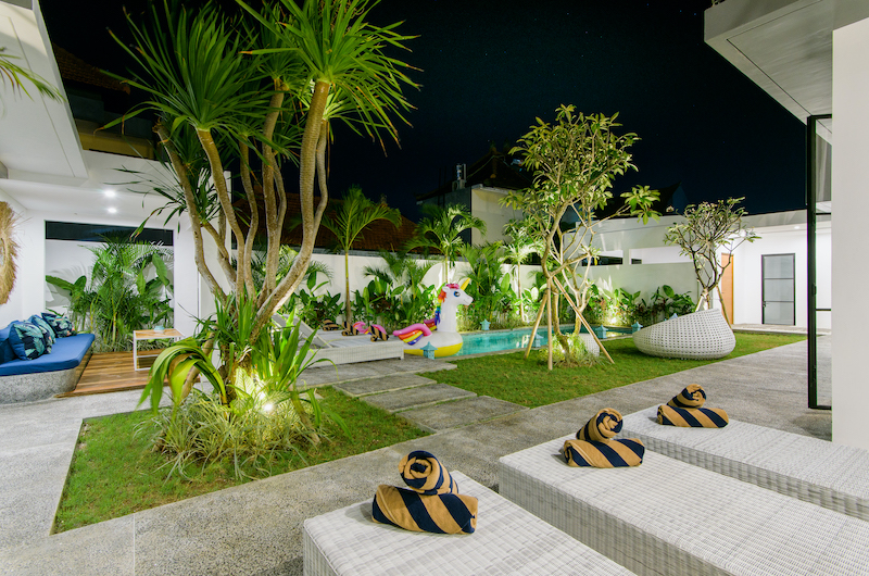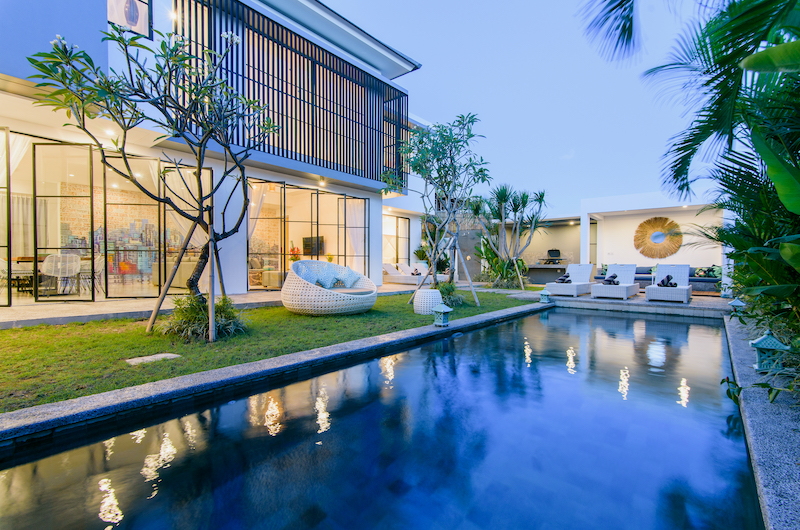 The chic white villa is surrounded by manicured green lawns hugging a sparkling blue swimming pool ideal for a midday dip. The poolside deck is lined with sun loungers, with a shaded lounge area offering a break from the tropical sun when needed.