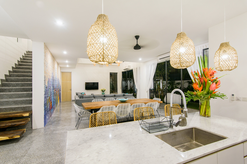 The dining area is located in the same fluid space as the living room, with a long wooden table surrounded by 10 chic white chairs. The same open-plan space also incorporates the villa’s well-furnished kitchen.
