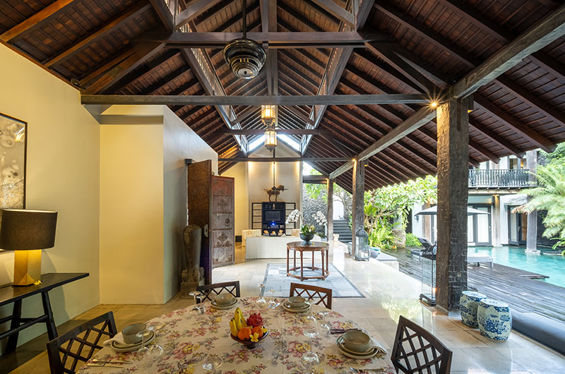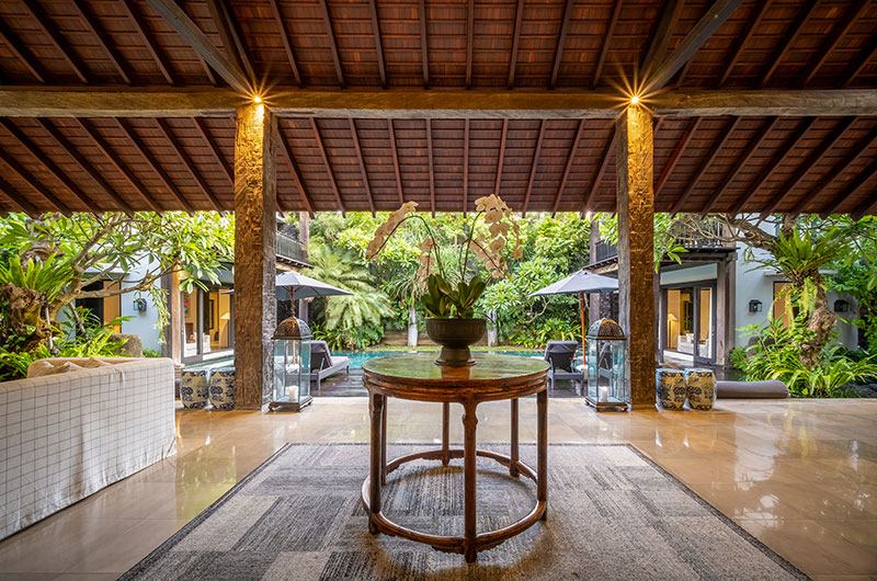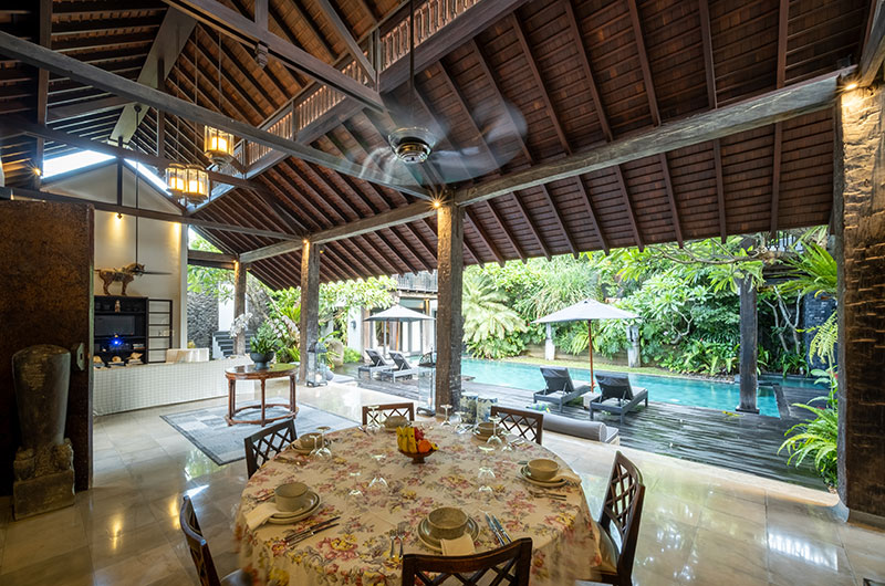 The spacious living and dining pavilions celebrate tropical living. Framed by the swimming pool, garden, fish ponds and a lovely sun deck, guests will enjoy the cool Balinese breeze complemented by ceiling fans. Black ironwood pillars recycled from old electricity poles, railway bridges and sleepers add an interesting artistic touch while supporting the red-tiled roof adorned by elegant glass lanterns.