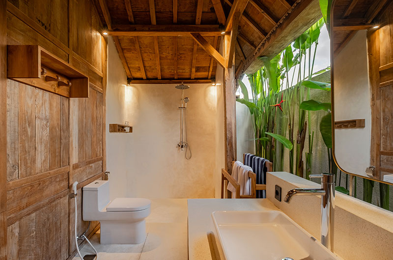 This room occupies the same pavilion as the third bedroom. It features a king-sized bed, writing desk, and closets. The adjoining bathroom has a semi open layout and features a rain shower, dual sinks, and a toilet.