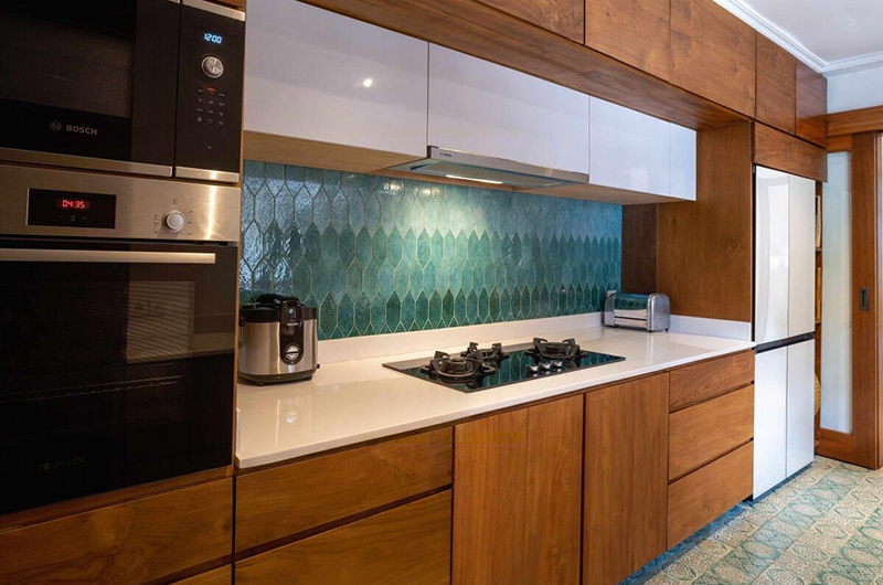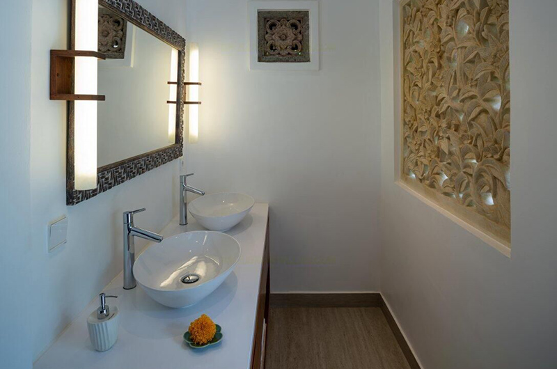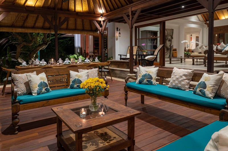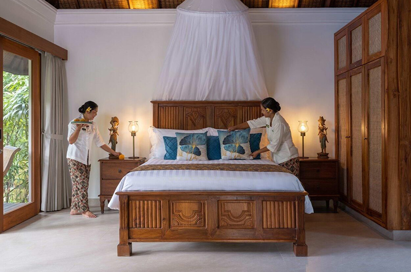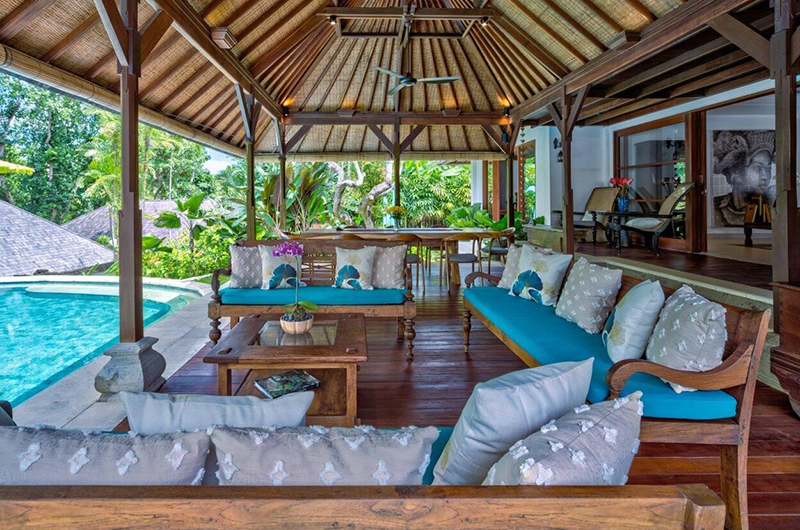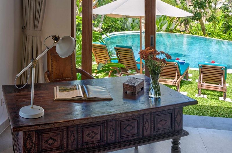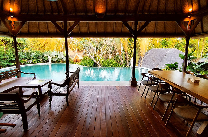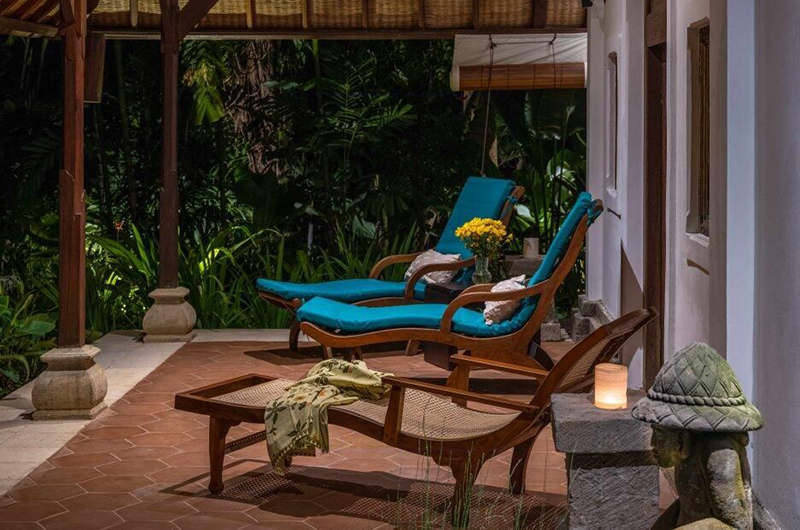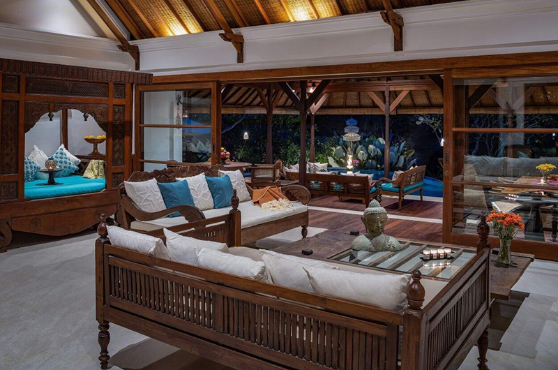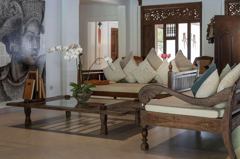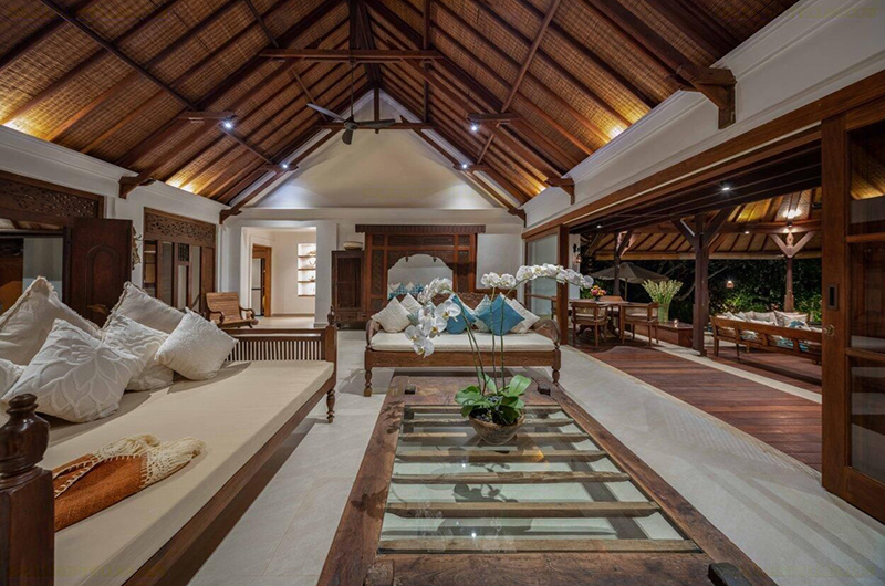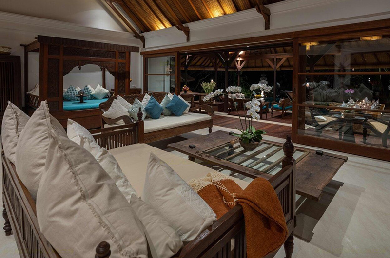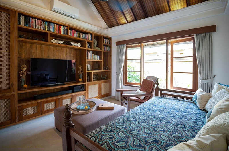 The main house features a generous living room with glass doors sliding open to a furnished terrace. The fan-cooled living room (which can also be fully enclosed to enjoy the AC) is styled with classic Balinese furniture, including carved wooden sofas made soft by red cushions and a beautiful Balinese daybed that’s ideal for an afternoon nap. The 65-inch Smart TV provides in-villa entertainment.