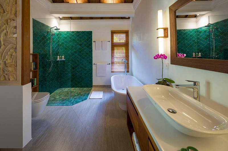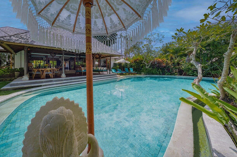 Villa Frangipani’s lush tropical gardens feature tranquil fish ponds and of course, the villa’s namesake frangipani trees. The lagoon shaped swimming pool is framed by a deck tiled with natural stones, with sun loungers and parasols offering a choice between sun and shade.