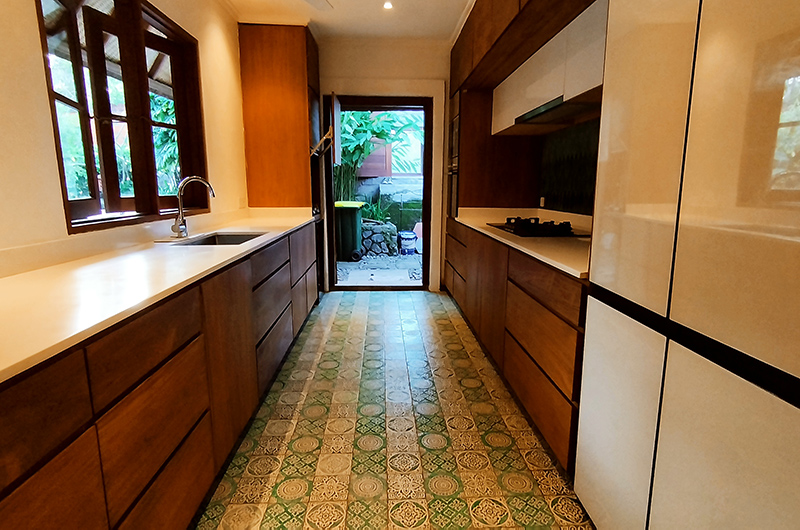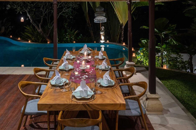 In true tropical style, Villa Frangipani’s dining table in located outside on the scenic shaded terrace, offering beautiful views of the pool and gardens. A fully equipped kitchen is located further back inside the main house.