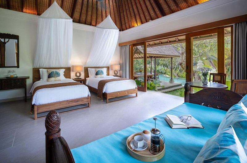 Villa Frangipani has four bedrooms. Two rooms have king-sized beds and two rooms have two single beds each. There are three bedrooms in the main house and one bedroom is housed in its own garden pavilion.