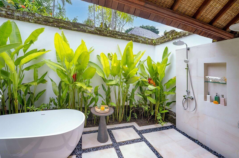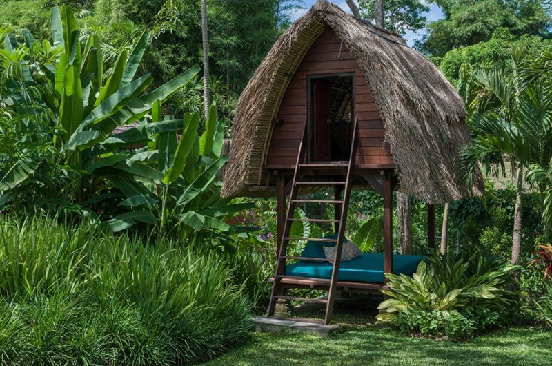 The fourth bedroom is housed in its own garden pavilion. The room has a queen-sized bed, a TV, a mini fridge and an ensuite bathroom with an outdoor shower.
