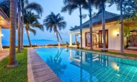Behind the water feature at the entrance is another pavilion which contains a separate lounge area with comfortable contemporary style furniture. This sits at the base of the blue-tiled saltwater swimming pool looking along its length across the garden, the beach and out to sea.