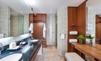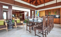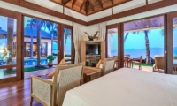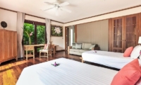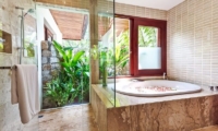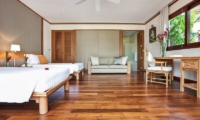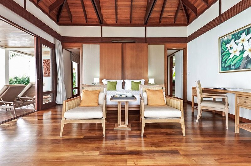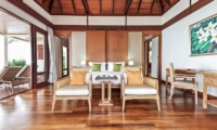 Between this room and the master suite is an alcove area which has a feature stone wall offering privacy to the master suite’s outdoor bathroom and it also provides a private poolside tanning area with two sun-loungers. The master suite has a double bed, comfortable seats, an antique TV cabinet and a walk-in dressing area. The en-suite bathroom has a shower and a bathtub looking out onto the feature stone wall with colorful plants adding to the natural feel of the room. Outside the master suite is a terrace with wooden garden furniture and a massage bed.