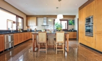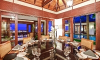 The kitchen has a feature island and breakfast bar and doors leading through to the traditionally styled dining room. Wall paneling and a beamed vaulted ceiling create a luxurious and tasteful dining area. An interesting water feature then separates the dining area from an indoor entertainment room which has a large dining table and built in fridges hidden behind sliding doors.