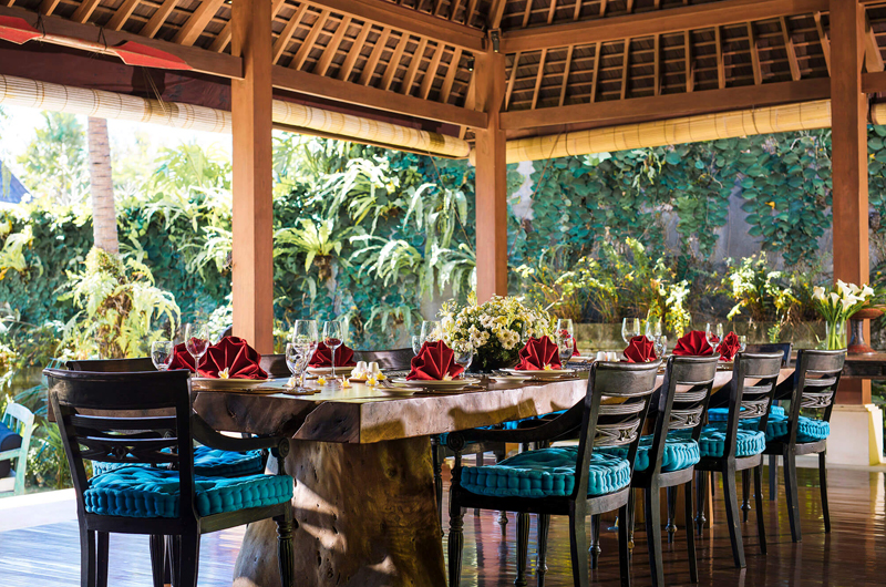 There are two spacious dining areas in the villa. One is in the Joglo pavilion interconnecting with the living room and can seat up to eight people. The other one overlooks the pool and can seat up to 12 guests. The villa includes both a guest and a staff kitchen.
