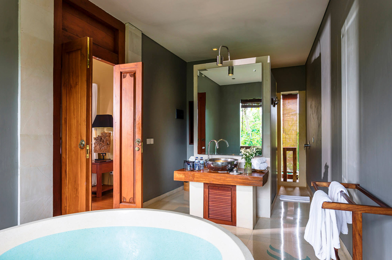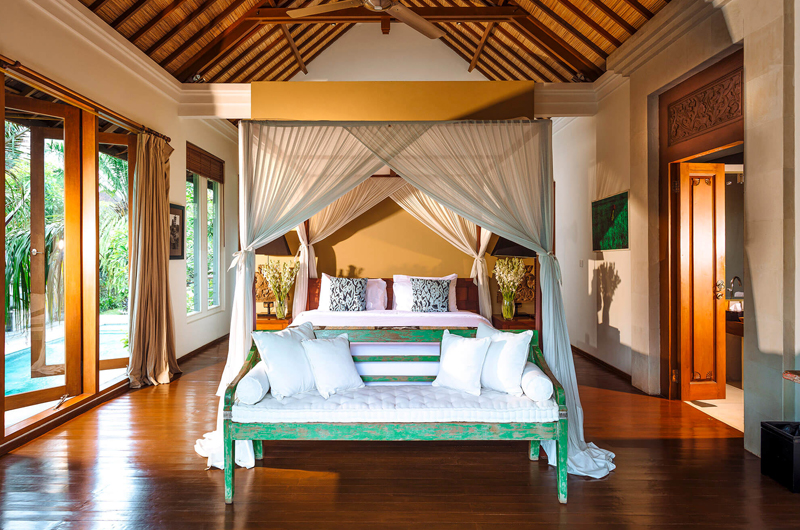 The master bedroom is housed in a pavilion directly facing one of the villa’s two pools. This room has a king-sized bed and a luxurious bathroom with a bathtub and shower.