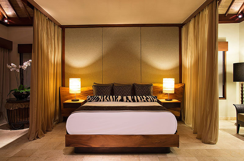 Crafted from a single slab of wood, the dining table is a real show piece, positioned in the middle of the open plan living room. Surrounded by elegant ottomans, the table can easily seat the whole group as you gather up for meals prepared in the villa’s fully equipped kitchen. Discretely tucked away from the living room, the kitchen offers all the essentials needed for preparing delicious meals – don’t worry, you can also leave all of that to the villa’s skilled staff if you prefer.