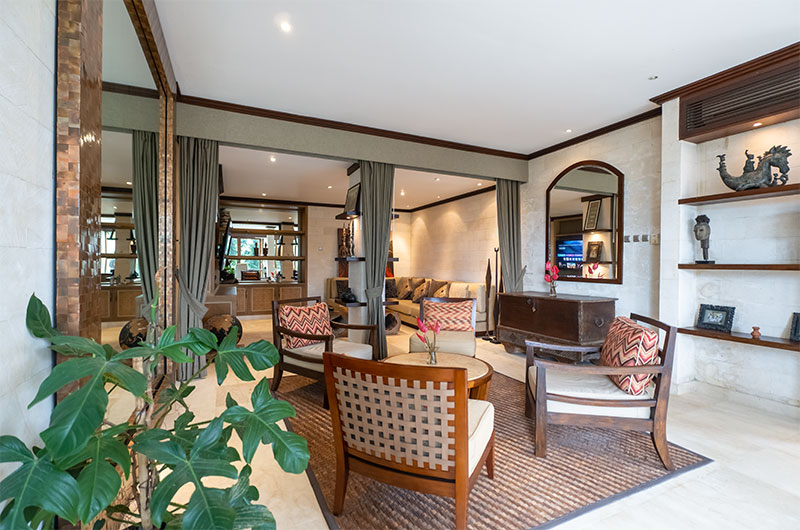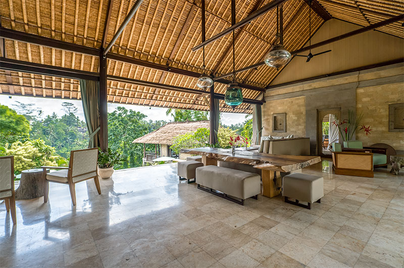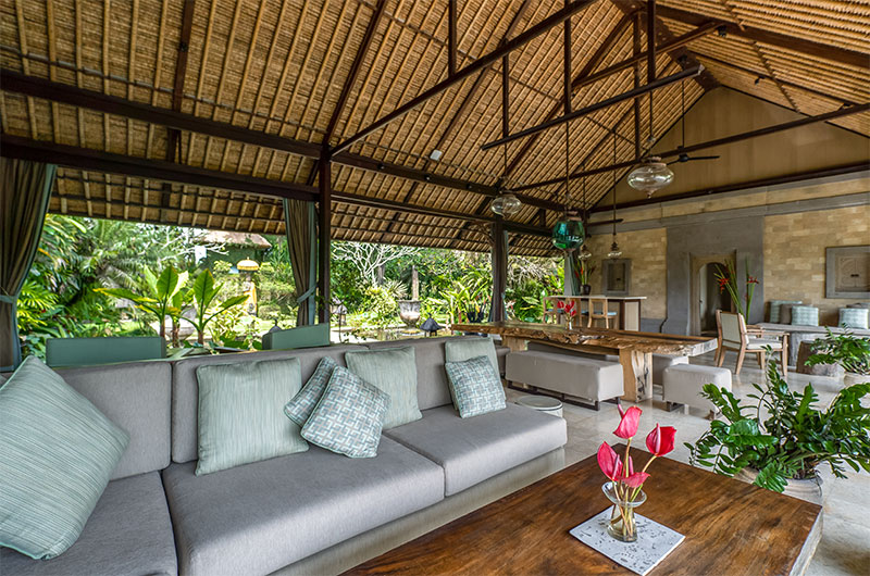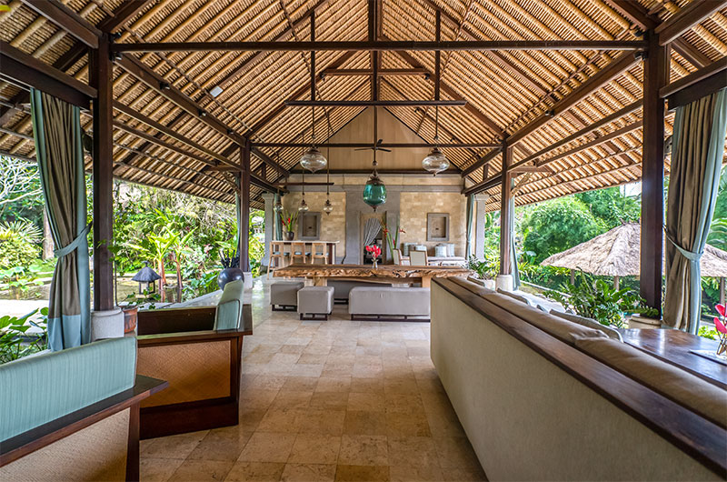 In true tropical style, the living room is a breezy, open plan space where you enjoy a constant connection with Bali’s beautiful nature. Taking pride of place at the highest point of the estate, the great room features a beautiful alang-alang ceiling and polished marble floors. You can plop down on the grey sofa to admire the scenery or nestle into one of the aquamarine chairs for a more intimate setting.