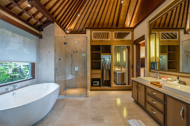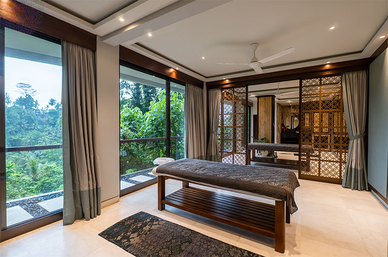 Bali is one of the spa capitals of the world so it’s only fitting that this villa in the heart of Bali features its own spa room. Framed by full wall windows looking out to the jungle, this spa room is both incredibly scenic and much larger than in most other villas. There are two massage beds here, with the option of closing the curtains between them if you would like simultaneous massages but with a little added privacy.