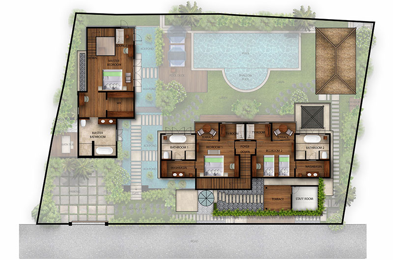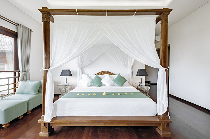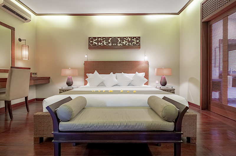 Villa Impian Manis has three bedrooms. Two rooms have king-sized beds and one room has two single beds. The master bedroom is housed in a two-storey pavilion above the spa. The two guest bedroom are located upstairs in the main house.