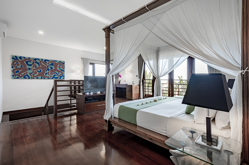 The master bedroom sits on the upper floor of the spa pavilion. The room has a beautiful four-poster bed, TV and an ensuite bathroom with a bathtub and shower.