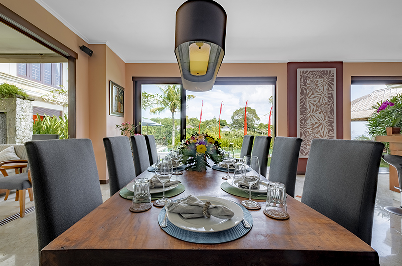 Flanked by the living room and the open-air lounge, the dining room sits on the ground floor of the main pavilion, with views of the pool and garden framing your every meal. Carved from a single slab of wood, the statement dining table can seat 10 guests on grey chairs, with a well-furnished kitchen located to the side of this air-conditioned room. Most of your meals will likely be enjoyed in the beautiful alfresco pavilion located outside by the pool.