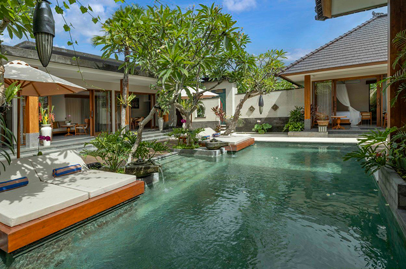 The villa’s lush layout follows that of a Balinese family compound, with lush tropical gardens nestled inside protective perimeter walls. This setup ensures a blissful sense of privacy throughout your stay. The neatly landscaped garden blooms with frangipani and other exotic flowers, with a glistening blue swimming pool shimmering at its centre. The pool is flanked by two double day beds and elegant parasols. If you prefer a place in the shade, there is a lovely daybed out on the living room terrace – yet another beautifully Balinese feature.