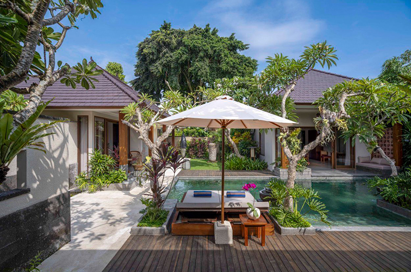 Villa Inara is a three-bedroom villa that’s divided into three standalone buildings. The main house features the living and dining room. The second pavilion houses two bedrooms. The third pavilion is located right by the 9-metre-long swimming pool and houses one bedroom.