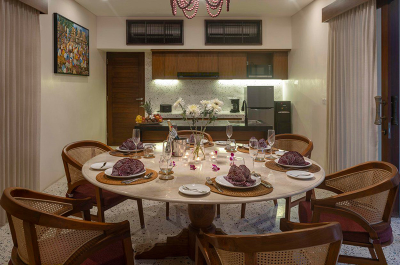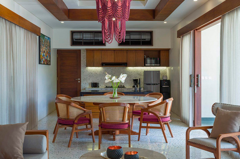 The dining area is a fluid extension of the air-conditioned living room. Six wicker dining chairs surround a polished circle table, with glass doors offering lush views of the pool and garden as you dine. The dining area is followed by a fully equipped open plan kitchen that’s fitted with all the crockery, cutlery and appliances you might need.