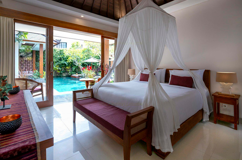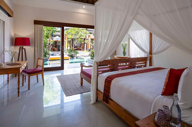 Villa Inara features three bedrooms decorated in classic Balinese style. The rooms are furnished with dreamy four-poster beds and each one is adjoined by an ensuite bathroom and a furnished veranda. One room is housed in a standalone pavilion by the pool, while the other two are housed side by side in a nearby garden pavilion.