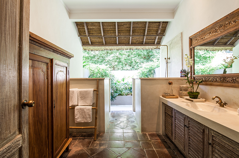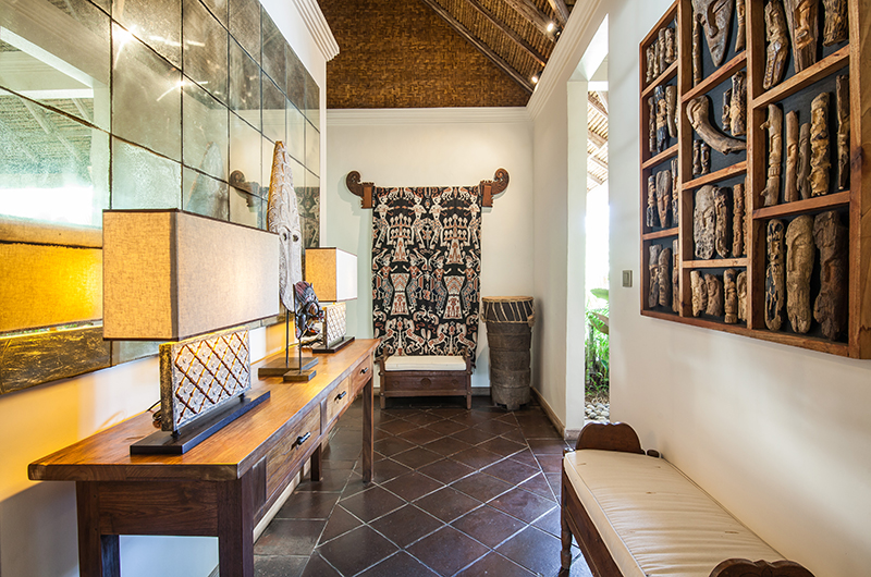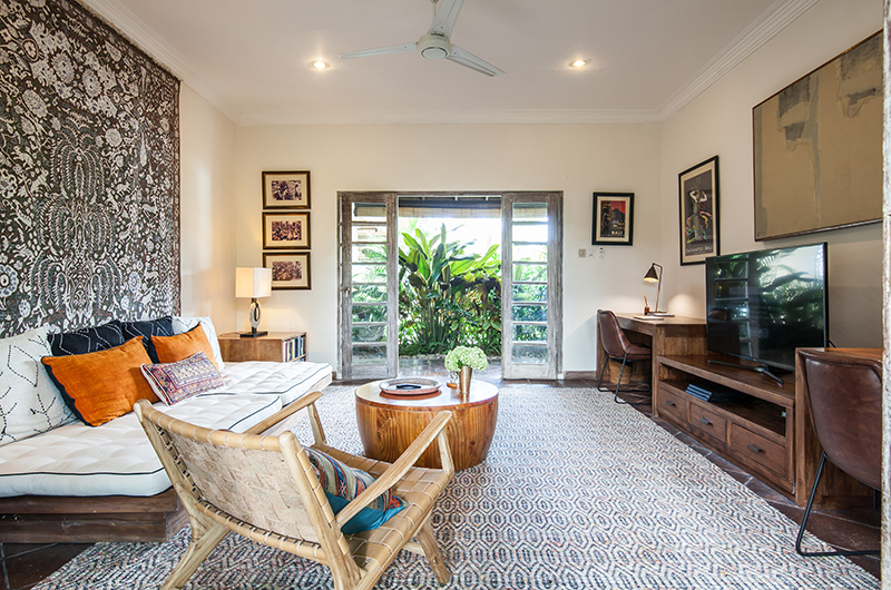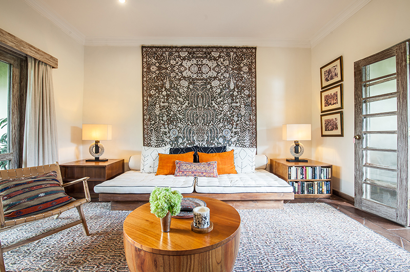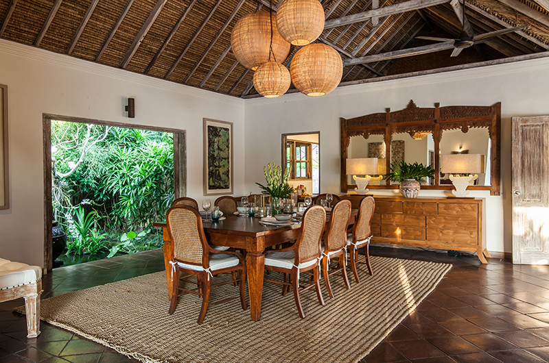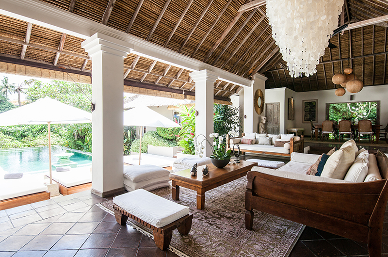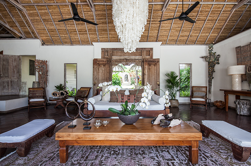 Villa Inti’s living room has an open-sided layout typical to the tropics, providing a refreshing breeze and direct views of the pool. The room is decorated with two sofas arranged around a coffee table, with stunning carpets and a seashell chandelier adding interest. The villa also has an enclosed TV room and also comes fitted with bluetooth speakers.