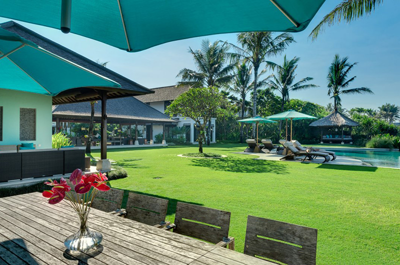 The beauty of Villa Jagaditha’s spectacular gardens with their fish ponds, tropical flowers, rolling green lawns and swaying palm trees is only rivalled by the ocean views which frame the villa’s sumptuous lagoon swimming pool. The poolside deck is dotted with sun loungers, with a photogenic bale gazebo offering a refreshing break in the shade. Guests can access the beach below directly from the garden.