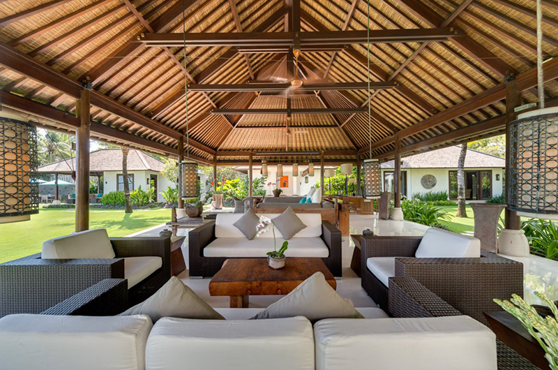 In true tropical style, Villa Jagaditha’s grand living pavilion has an open-sided layout allowing for direct views of the villa’s grandiose grounds as well as for a fresh ocean breeze to flow through freely. Crowned by a classic alang-alang ceiling and cooled by ceiling fans, the living area is furnished with sofas and a lavish daybed, allowing for relaxed mingling framed by once in a lifetime ocean views. For some indoor entertainment, Villa Jagaditha offers an air-conditioned TV room located in the same pavilion with the gym.