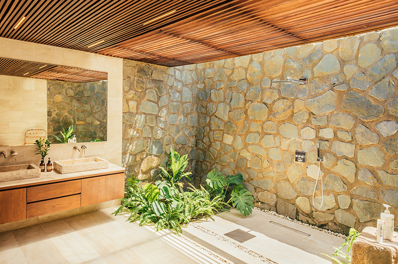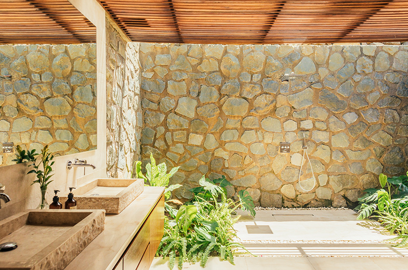 The third bedroom is located on a lower floor. The room is accessed through an external staircase, making this the most private bedroom in the villa. Again, the room features generous windows which gaze over tropical treetops and out to the Indian Ocean. The room is furnished with a king-sized bed and ample wardrobes. Sliding doors reveal a beautiful bathroom which flanks the room, equipped with a washstand, a rain shower and a toilet.