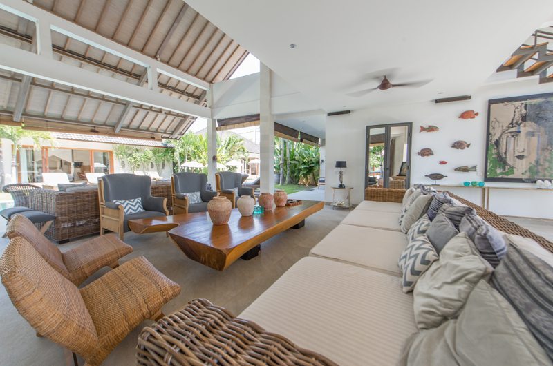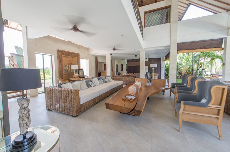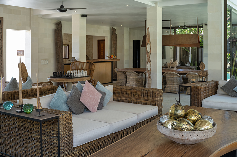 Villa Kadek’s living room has an open-sided layout with direct views of the pool and garden. The living room features a beautiful coffee table crafted from a single slab of wood, with ample sofas offering room for the whole group. The living room also features a LED HD TV.