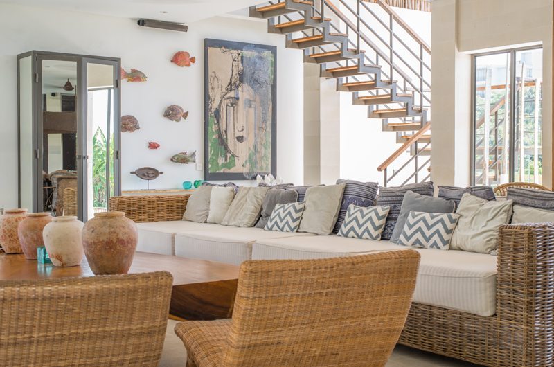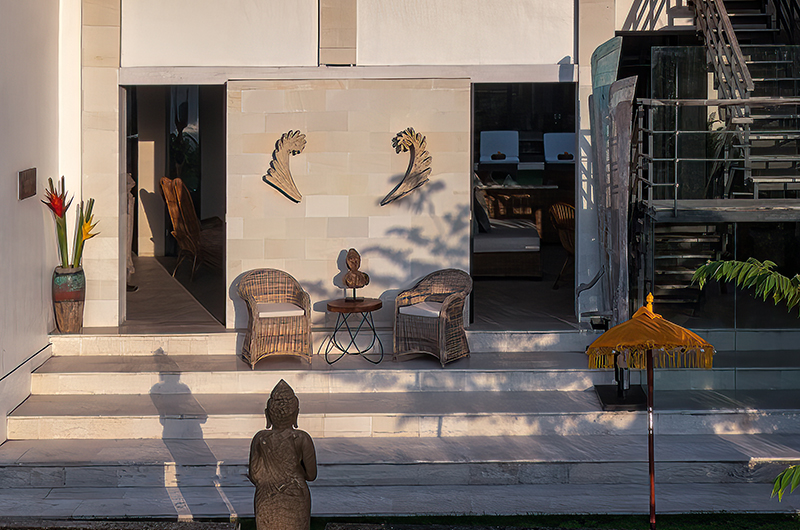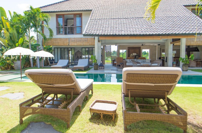 Villa Kadek is a five-bedroom villa with bedrooms built around the swimming pool. Three bedrooms have king-sized beds and two have singles that can be combined to create a king configuration if needed. There are three bedrooms on the ground floor and two bedrooms are housed upstairs.