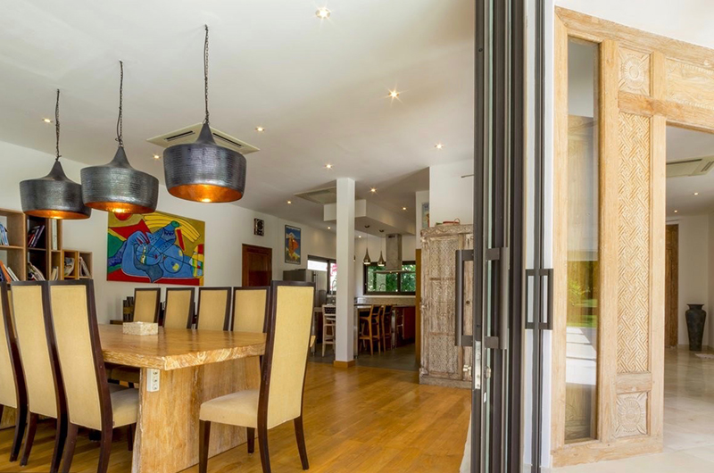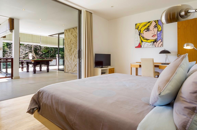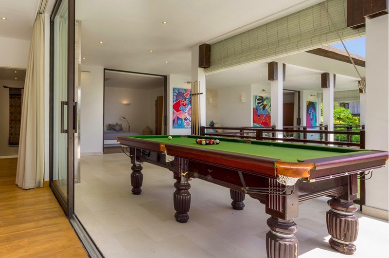 The living room is a large and airy space decorated with light earth tones, with glass doors sliding open to the garden. When the doors are closed, guests can relax in air-conditioned comfort. The living room features a large leather sofa with a stylish retro edge to it, with a nearby desk area offering an ideal work zone for guests wanting to catch up on emails while on holiday. The villa also comes with a large flatscreen TV with a sound system. For added entertainment, there’s also a billiard table on the upper floor.