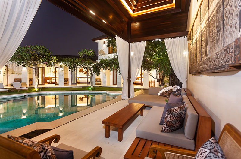 Villa Lenú is set amidst lush tropical gardens that capture the beauty and allure of Bali’s eternal summer. Surrounded by frangipani and palm trees is the villa’s show stopping swimming pool whose unique angles seem to mimic the shape of a gem stone. The pool is two metres deep and features a shallow section that will delight the kiddos. A row of sun beds and a dainty Balinese parasol frame the pool. A beautiful gazebo furnished with comfortable sofas and framed by romantic curtains completes this idyllic tableau.