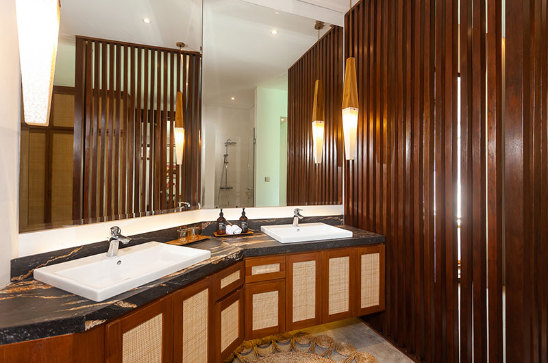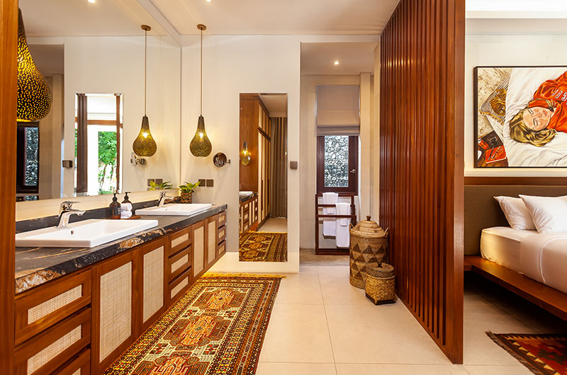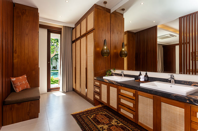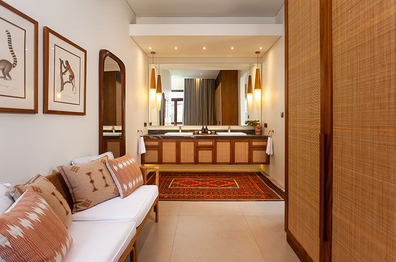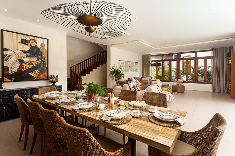 Positioned just a few easy steps from the living room sofas, the villa’s dining area offers the perfect setup for relaxed meals enjoyed with friends and family. A long timber dining table is surrounded by modern wicker chairs and illuminated by a stunning lamp that mimics the shape of a Balinese parasol. The dining area extends to an open plan kitchen that’s fitted with all the essentials, including a coffee machine, blender, rice cooker, panini grill… and more.