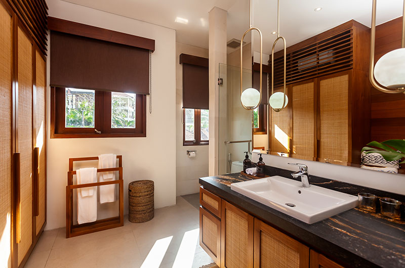 This is one of two bedrooms located on the villa’s upper floor. This beautiful room features a king-sized bed and benefits from an ensuite bathroom that’s fitted with a shower, vanity, and toilet.