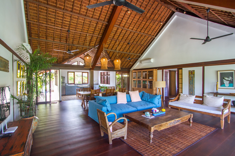 Villa Mahe is a spacious three-bedroom villa. The villa is slightly elevated from the pool and garden, with steps leading down to the pool from the living room. The villa has two bedrooms with king-sized beds and one room with two single beds that’s perfect for kids. All three rooms have ensuite bathrooms with a tropical open-air layout.