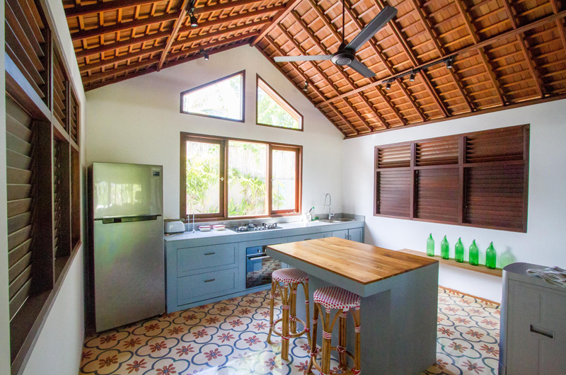 The dining table sits behind the living area and seats up to six guests. With its tiled floors and retro inspired furniture, the villa’s fully-equipped kitchen is one of the most beautiful kitchens in Bali.