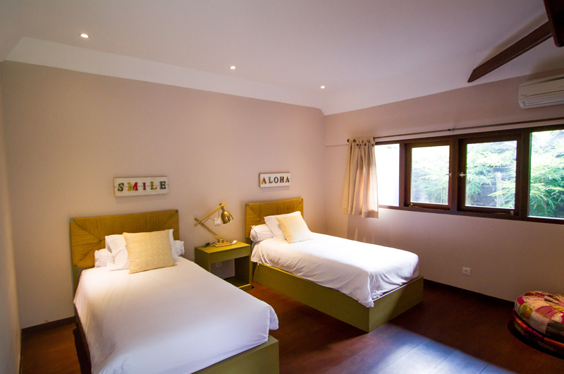 The second guest bedroom features two single beds and bohemian artwork spelling “Aloha” on the wall. This bedroom has a large open-air bathroom with a double sink and rainfall shower. The tropical layout is beautiful, but not ideal for those who prefer privacy.