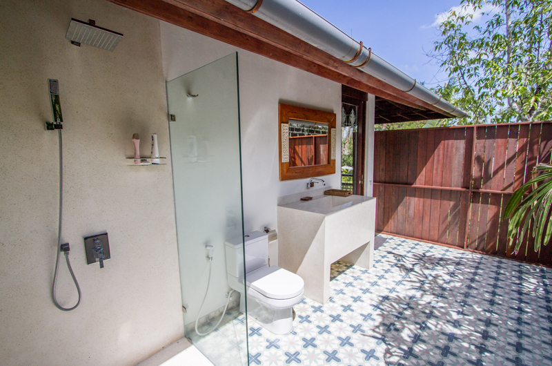 The first guest bedroom has a king-sized bed with a gorgeous carved headboard. The ensuite bathroom has a tropical open-air layout, beautiful tiled floors and a rainfall shower.
